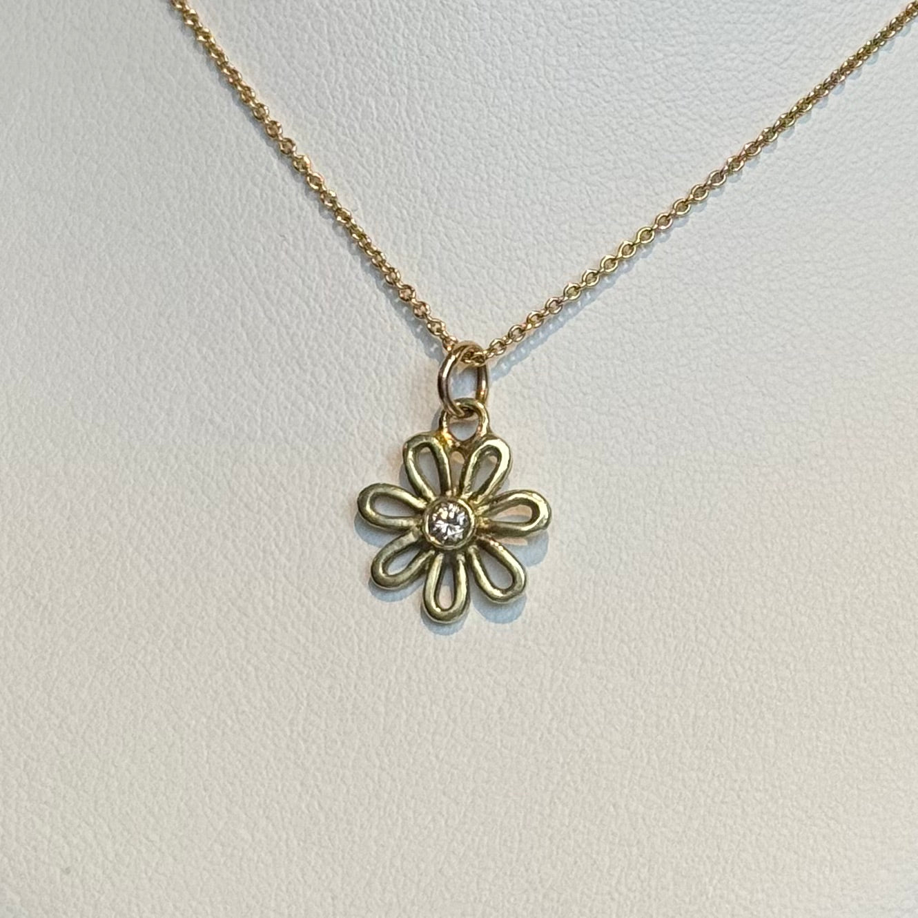 Derek Simpson designed pendant, single diamond bezel-set in floral bezel 14k gold on 16" 14k cable link gold chain.