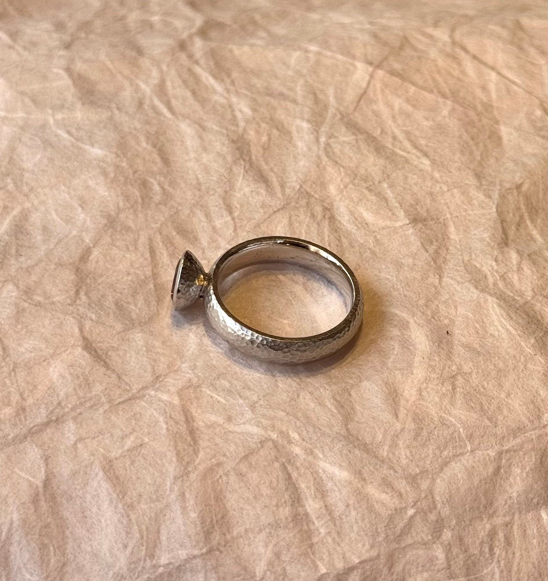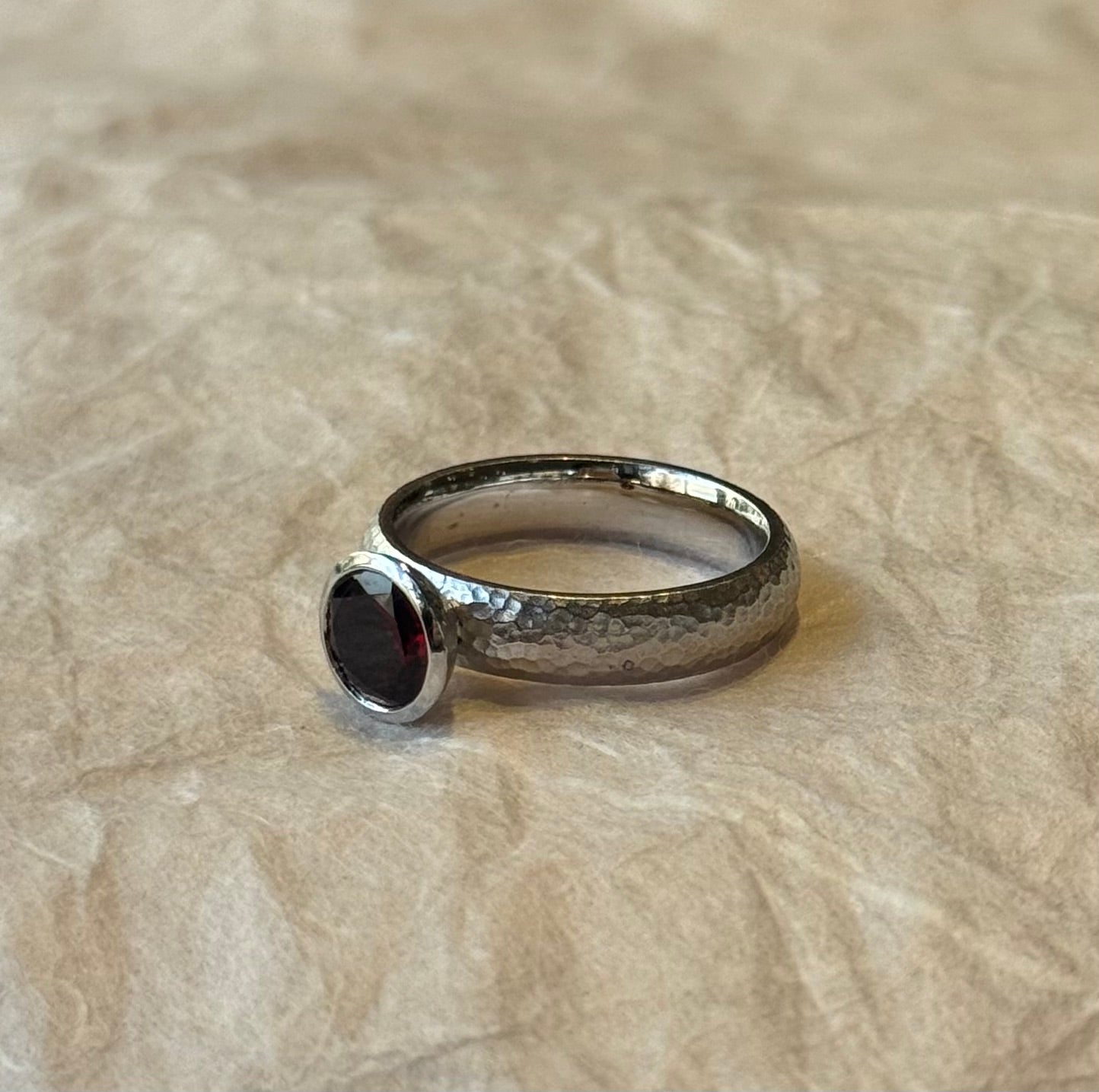 Derek Simpson designed textured sterling silver band, with bezel set garnet 8mm.