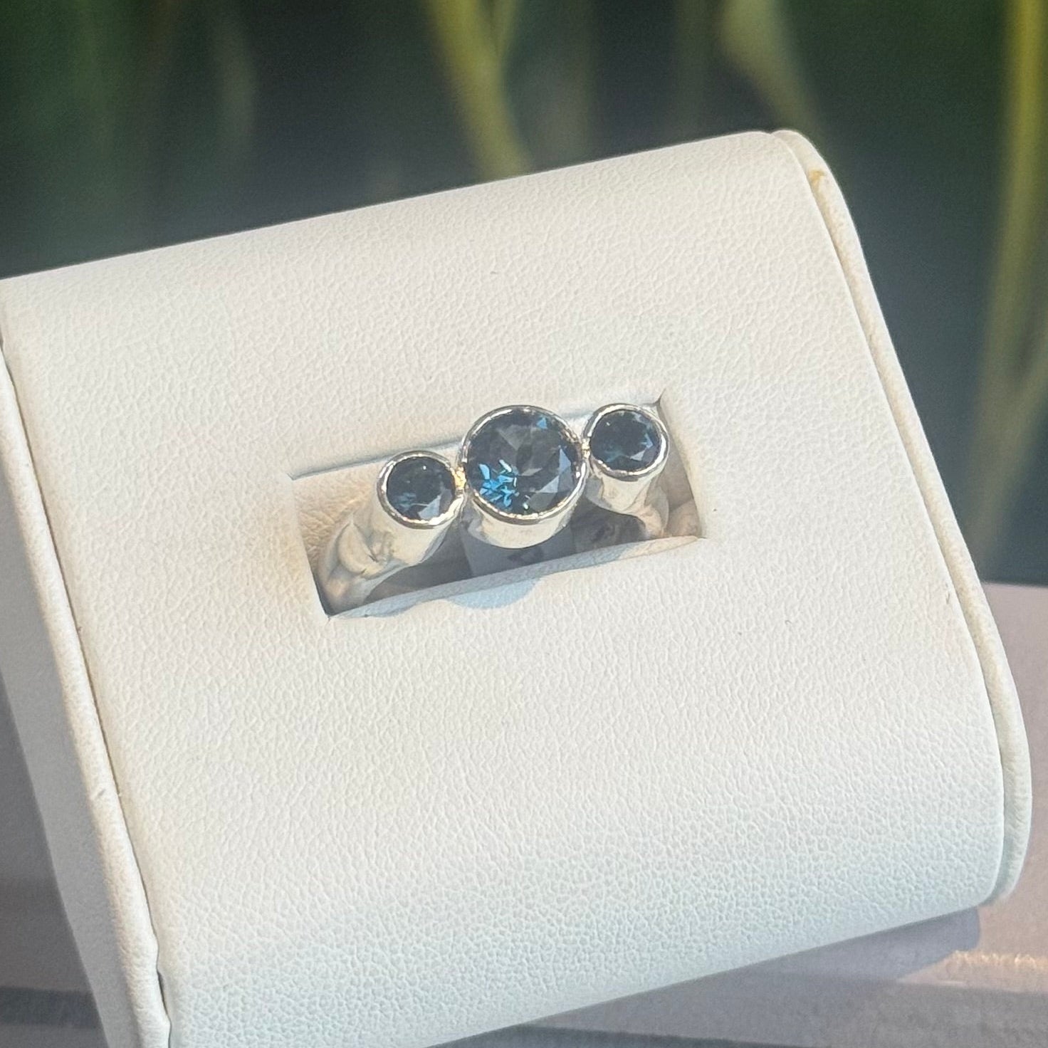Derek Simpson designed sterling silver ring with three round brilliant London Blue Topaz bezel set.