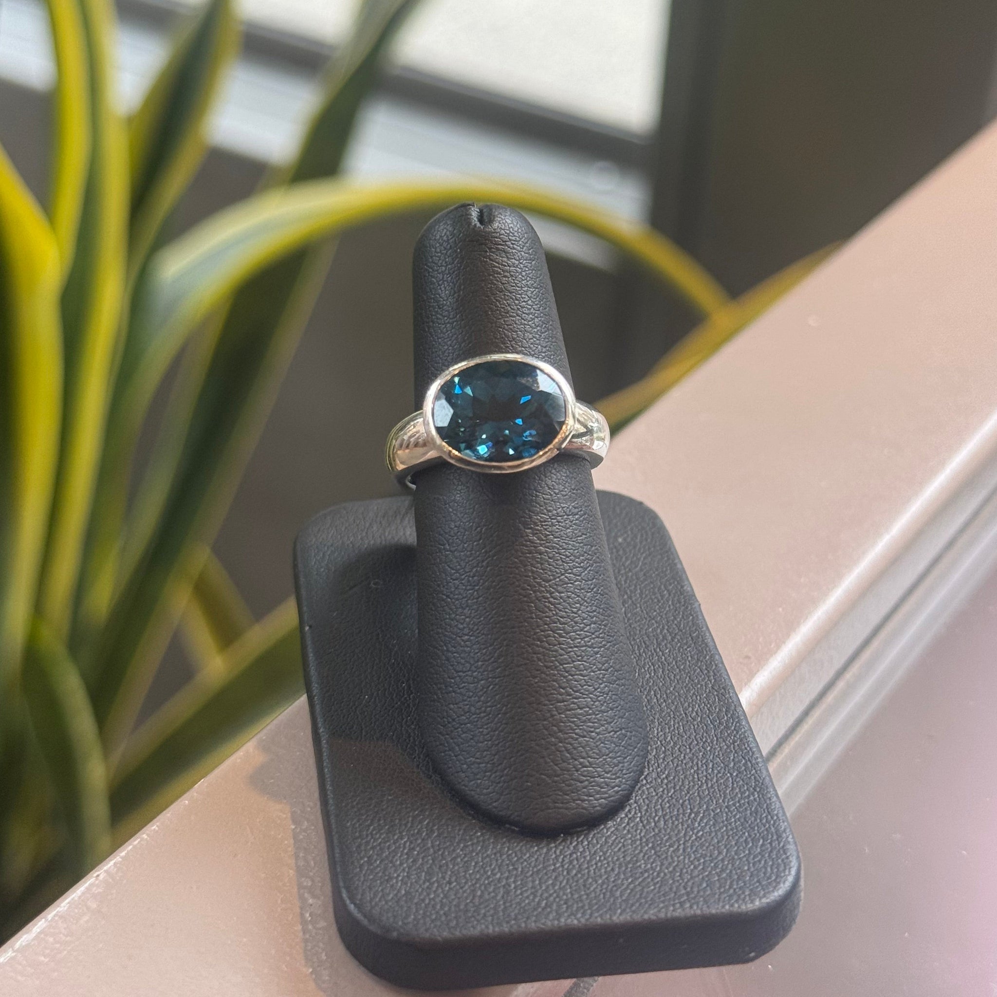 Derek Simpson designed east-west orientation oval London blue topaz, bezel-set in a sterling silver band.