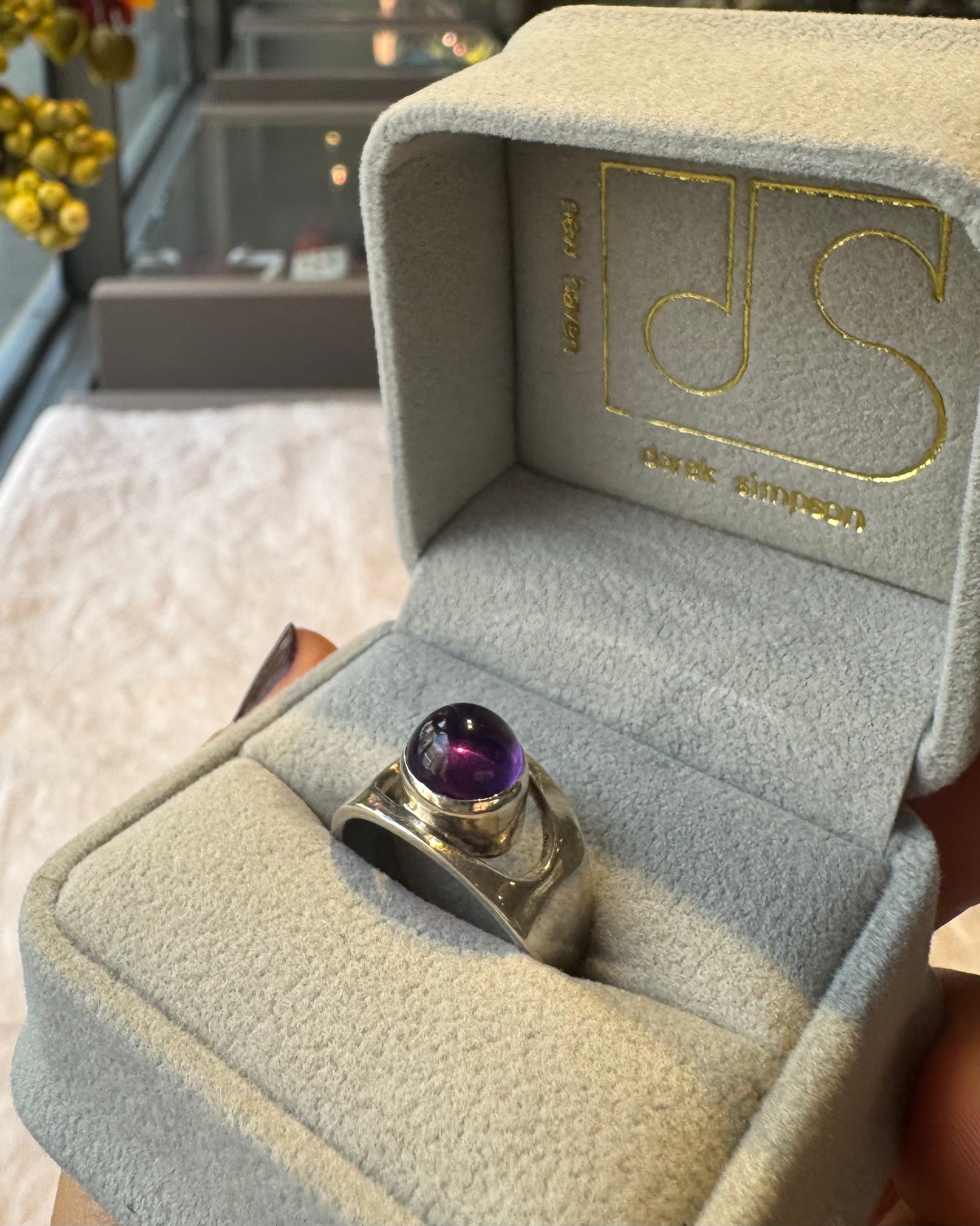 Derek Simpson designed sterling silver cigar band with bezel set 8mm cabochon amethyst framed by cutouts.