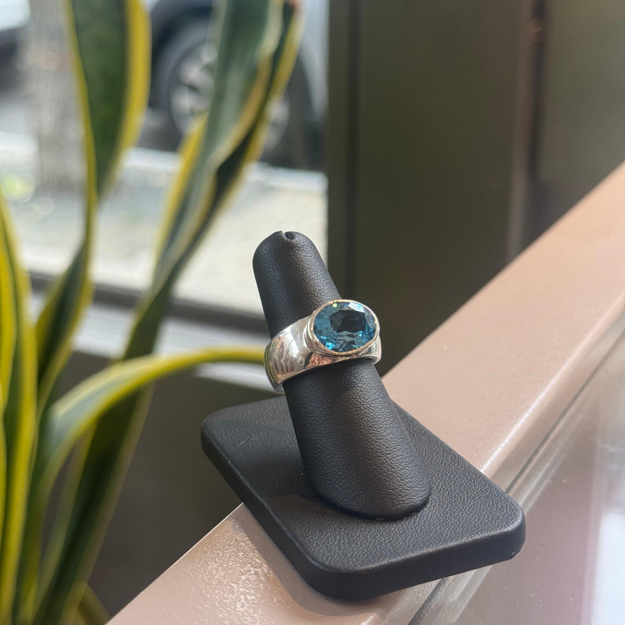 Derek Simpson designed sterling silver band with east-west orientated oval cut Swiss blue topaz, bezel set.