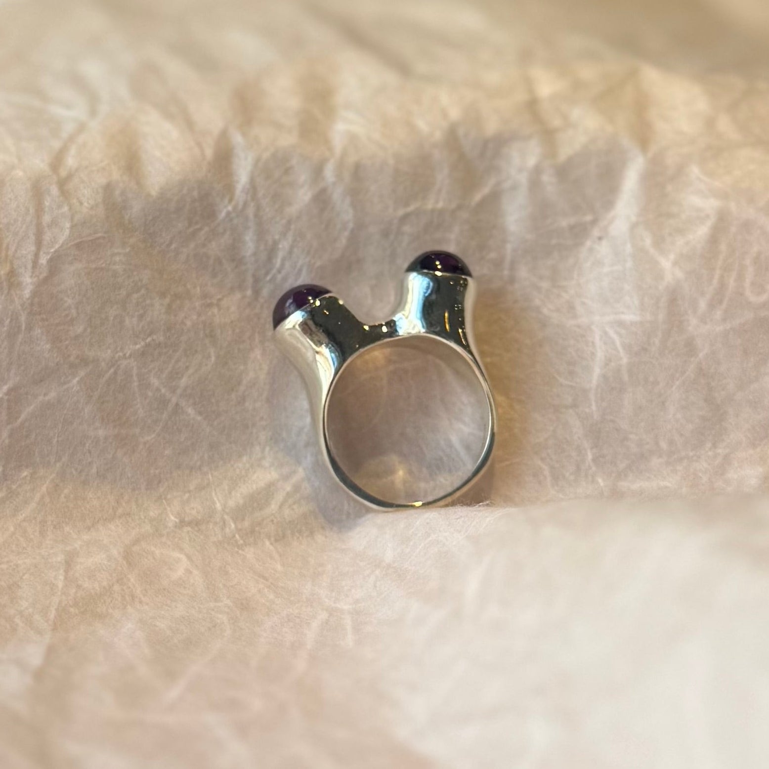 Derek Simpson designed sterling silver with bezel set 8mm cabochon amethysts.