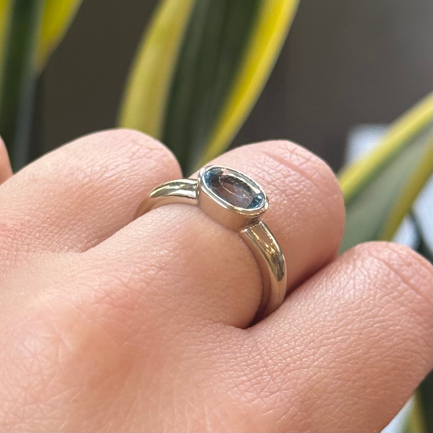 Derek Simpson designed, solitaire oval aquamarine (8x6mm and 1.2 cts) east-west orientation bezel set in 14k white gold.