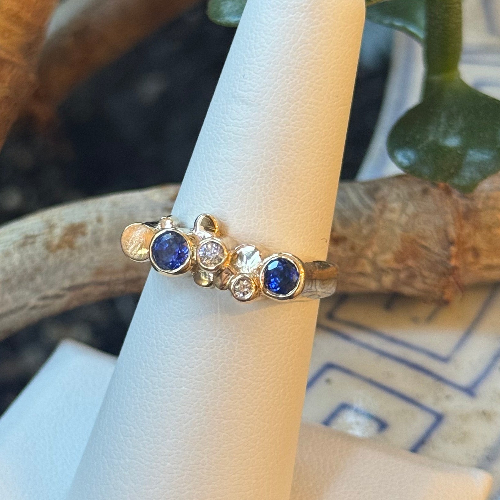 Derek Simpson designed 14k yellow gold ring with two round diamonds (.09 TCW) and two round sapphires (.75 TCW) bezel set in alternating elevation bezels.