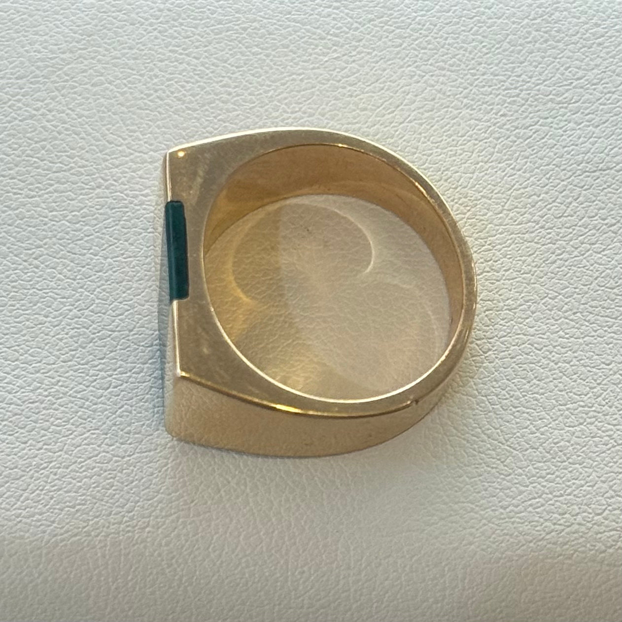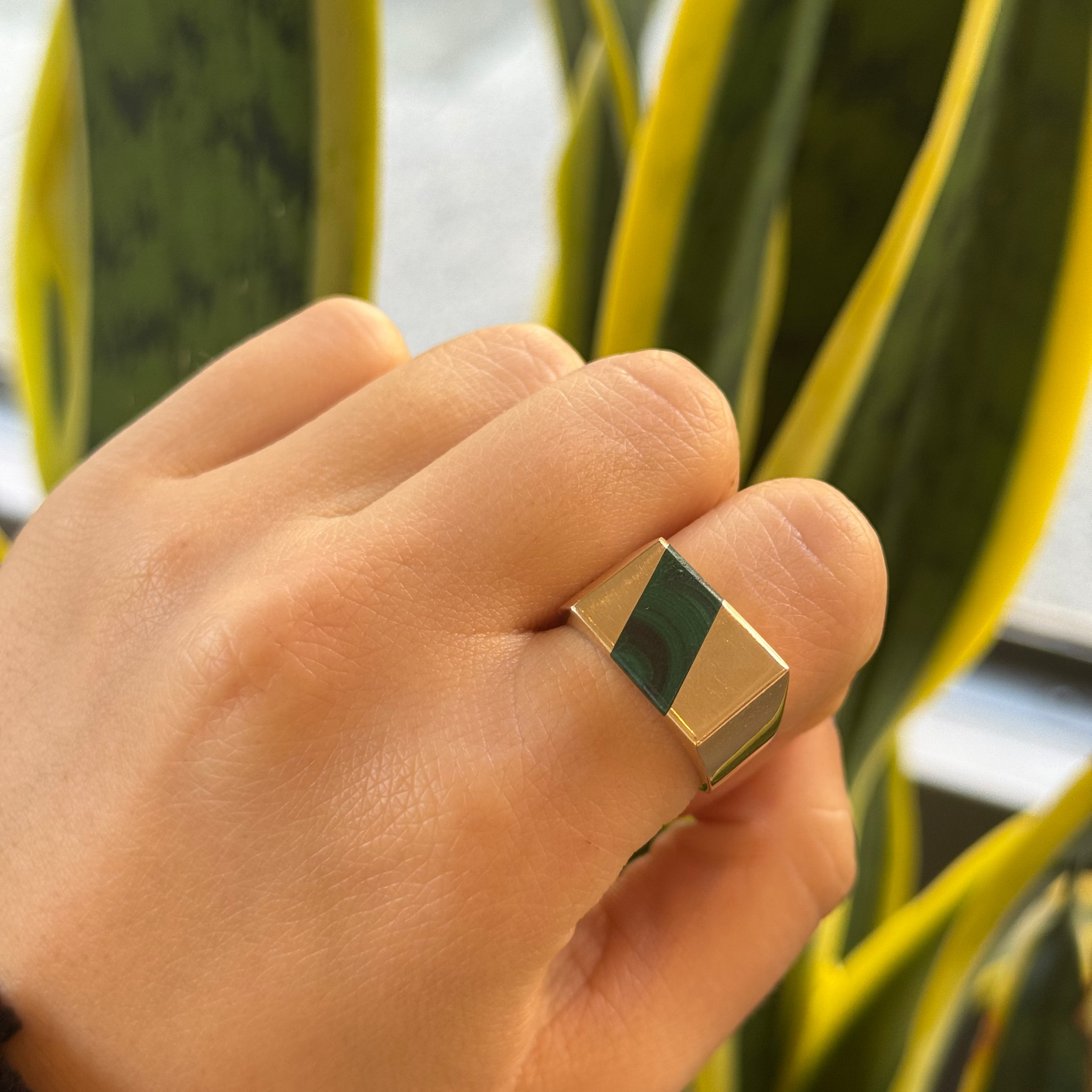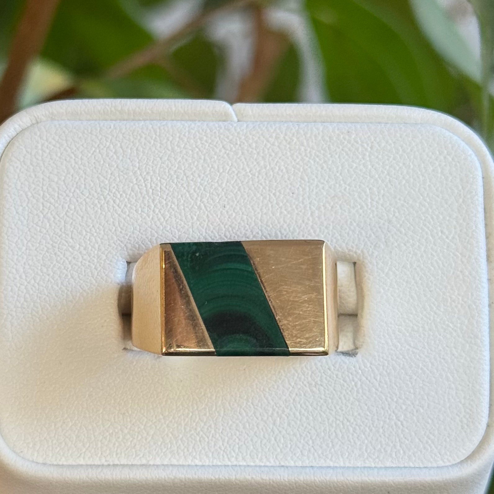 Derek Simpson designed 14k yellow gold with malachite slice, flat top ring.