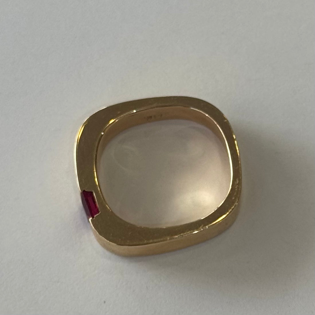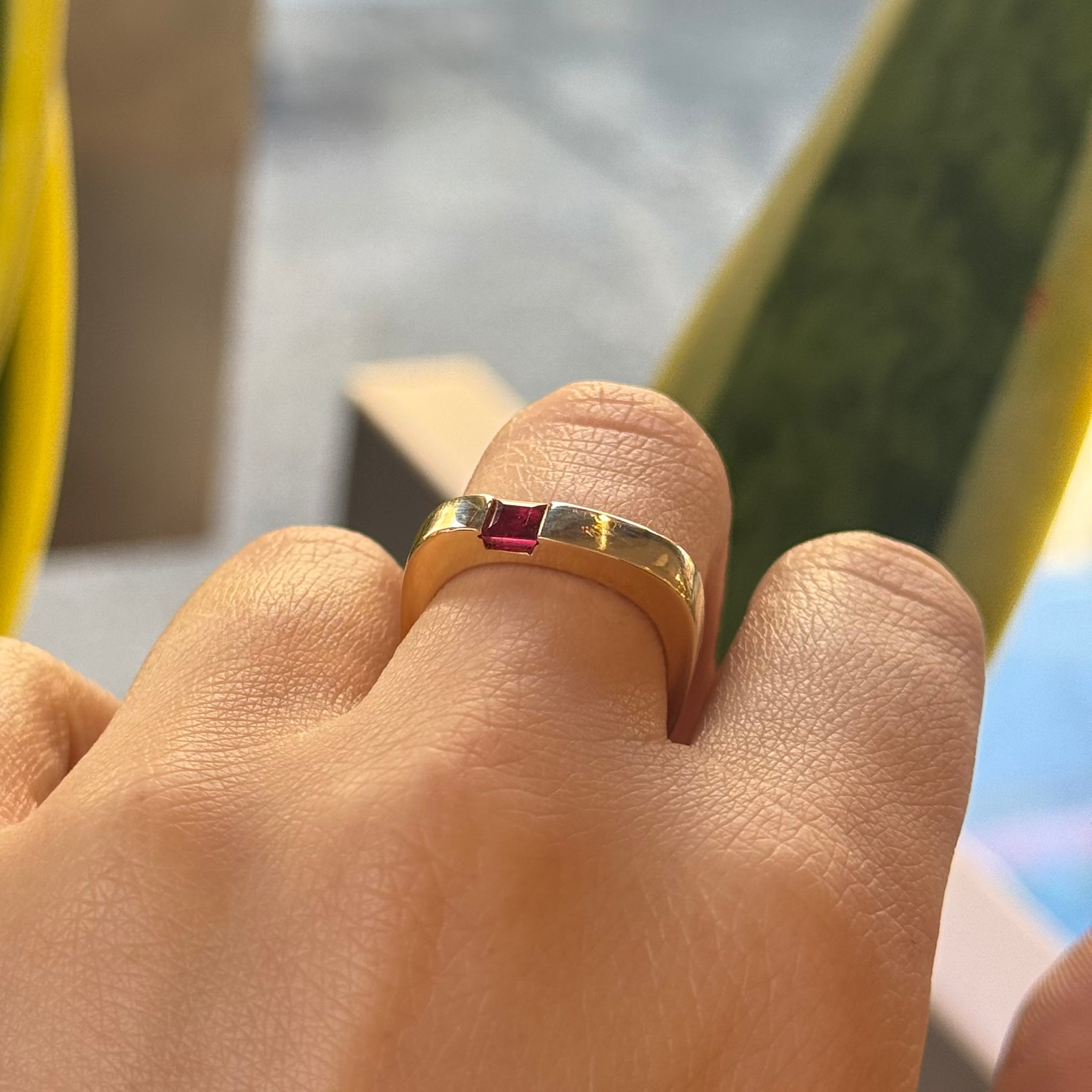 Derek Simpson designed 14k yellow gold gently squared band with off center square cut ruby (3.9mm and .43ct).